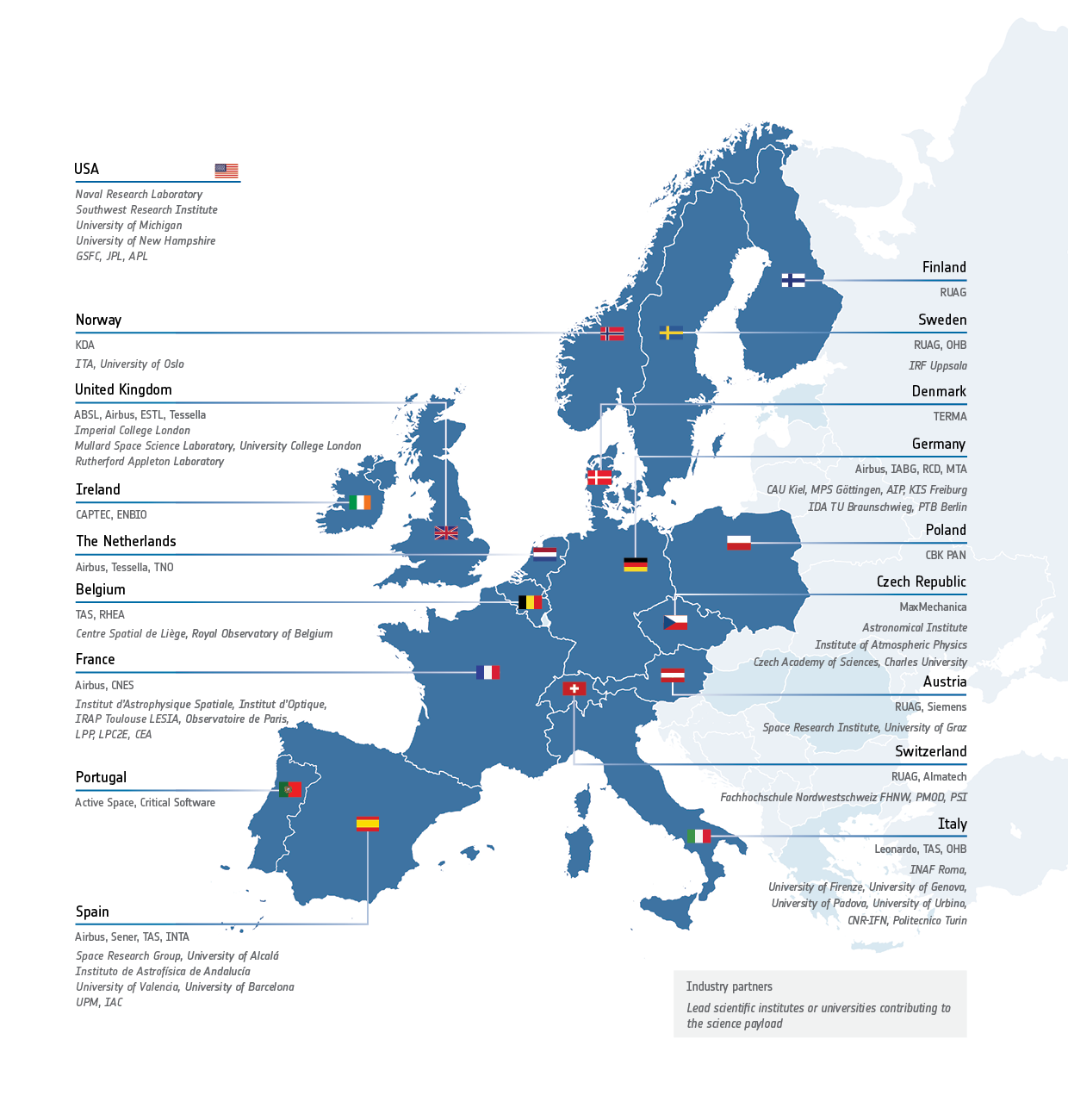 Countries contributing to the development of Solar Orbiter. The map highlights industry partners and the lead scientific institutes or universities contributing to the science payload.