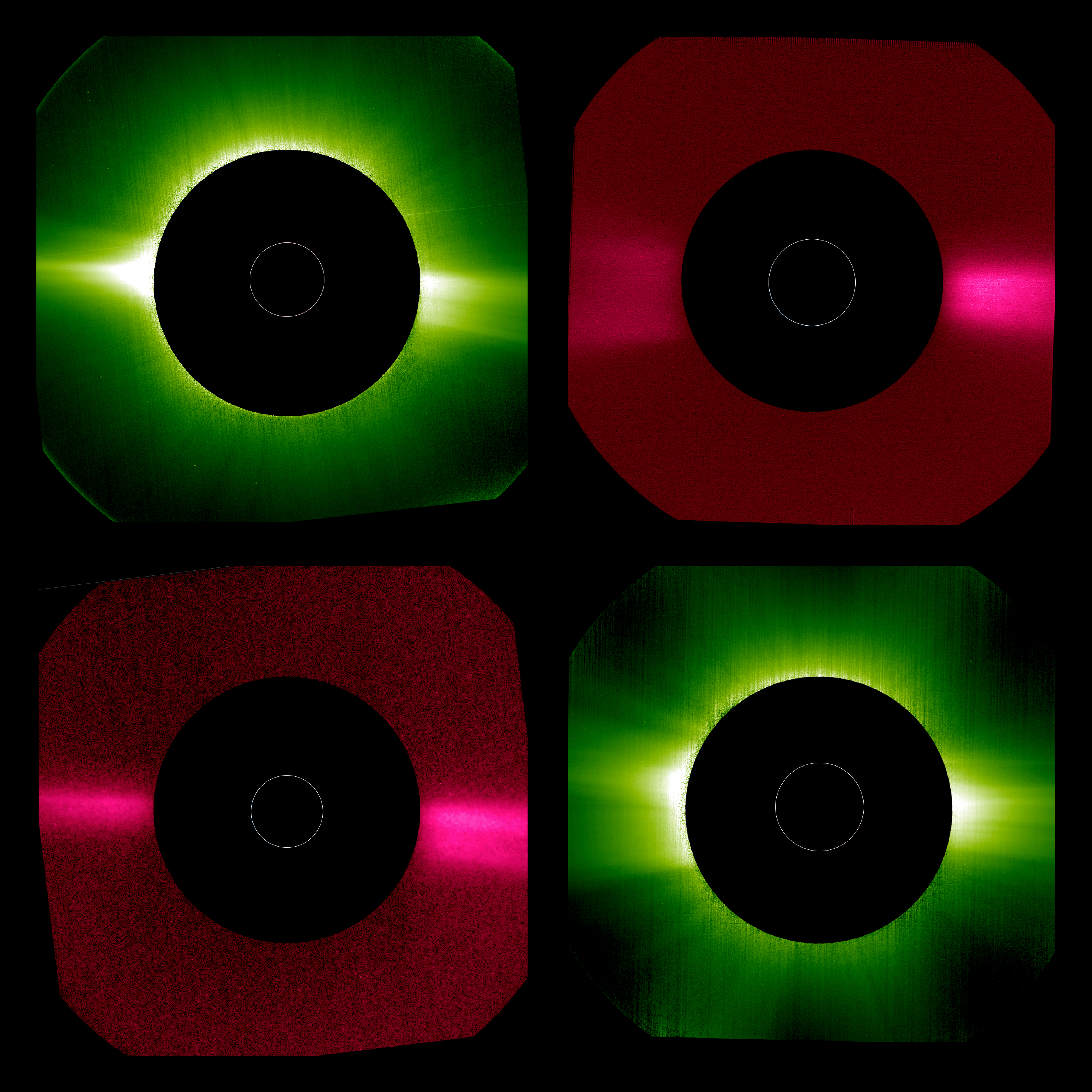 The Metis coronagraph on ESA's Solar Orbiter scored a couple of 'world firsts' with its first light image. Metis is a coronagraph, which blocks out the dazzling light from the solar surface, allowing the fainter outer atmosphere of the Sun, the corona, to be seen. Its first light images, taken on 15 May 2020, and displayed here in the left hand column, are the first simultaneous images of the corona taken in both visible light (580-640 nm) and ultraviolet light (UV, 121.6 nm).