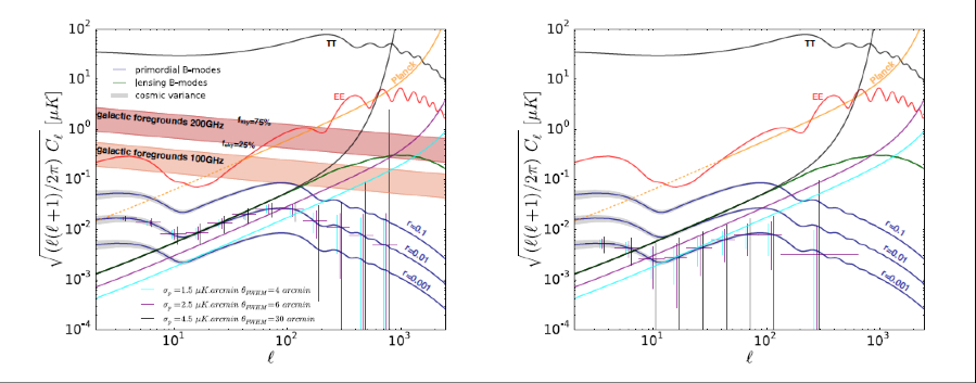 Expected sensitivity of CMB Polarisation to the B-mode power spectrum. The blue lines show the theoretical B-mode power spectra from tensor modes with r = 0.1, 0.01, and 0.001. The left and right panels show the expected error bars on the B-mode power spectrum for the fiducial amplitudes of tensor modes with r = 0.01 and 0.001, respectively.