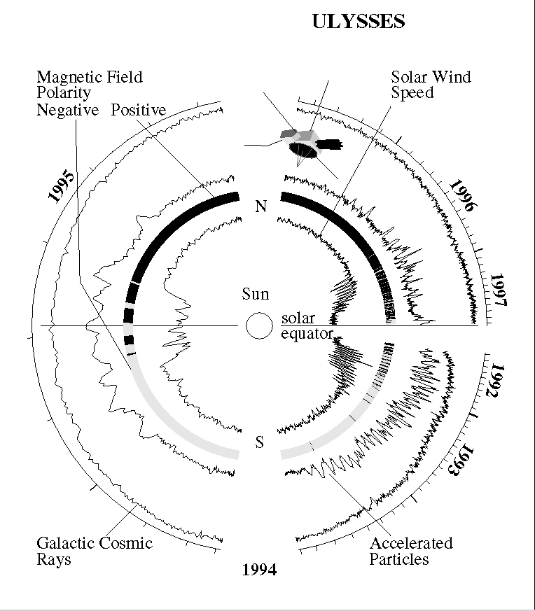 A polar plot showing actual measurements of solar wind speed (linear scale, approx. range 350-800 km/s), magnetic field (polarity), energetic particles and cosmic rays (logarithmic scales, with the cosmic ray trace offset with respect to the lower-energy particles) acquired by the Ulysses experiments. Particularly striking is the uniform fast (750 km/s) solar wind that fills a large fraction of the heliosphere above 30 degrees latitude in both hemispheres. Other noteworthy features are: