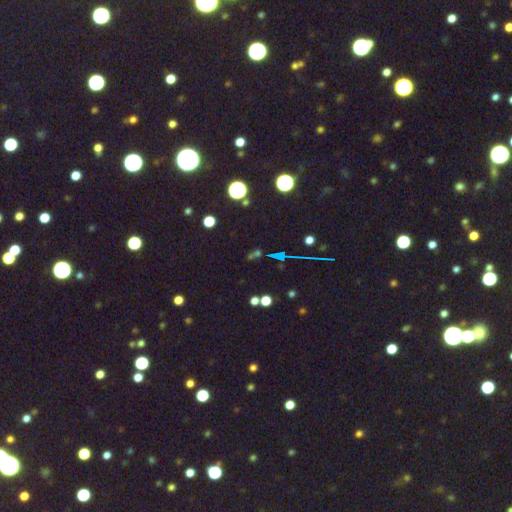 This optical image, taken with the National Science Foundation's Blanco 4-meter telescope at Cerro Tololo Inter-American Observatory in Chile during the morning of 23 November 2001, shows the optical transient a day and a half after the initial burst. The transient had faded in brightness from its peak by more than a factor of 100 in that period of time. The reddish dot adjoining the gamma-ray burst, at its lower left, is probably the core of the galaxy in which the gamma-ray burst occurred.