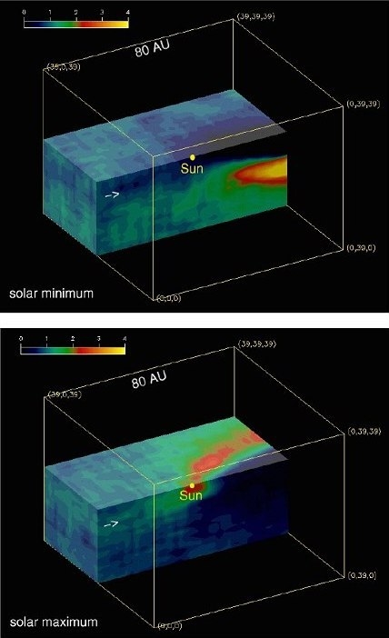 The pictures above show cut-aways of where interstellar dust is concentrated in the Solar System - high concentration: red/yellow, low concentration: blue/green (the planets are not shown). During solar minimum (top picture) most interstellar dust can be found above or below the Sun, while at the solar maximum (bottom picture) the dust is concentrated close to the Sun in the plane of the planets' orbits.