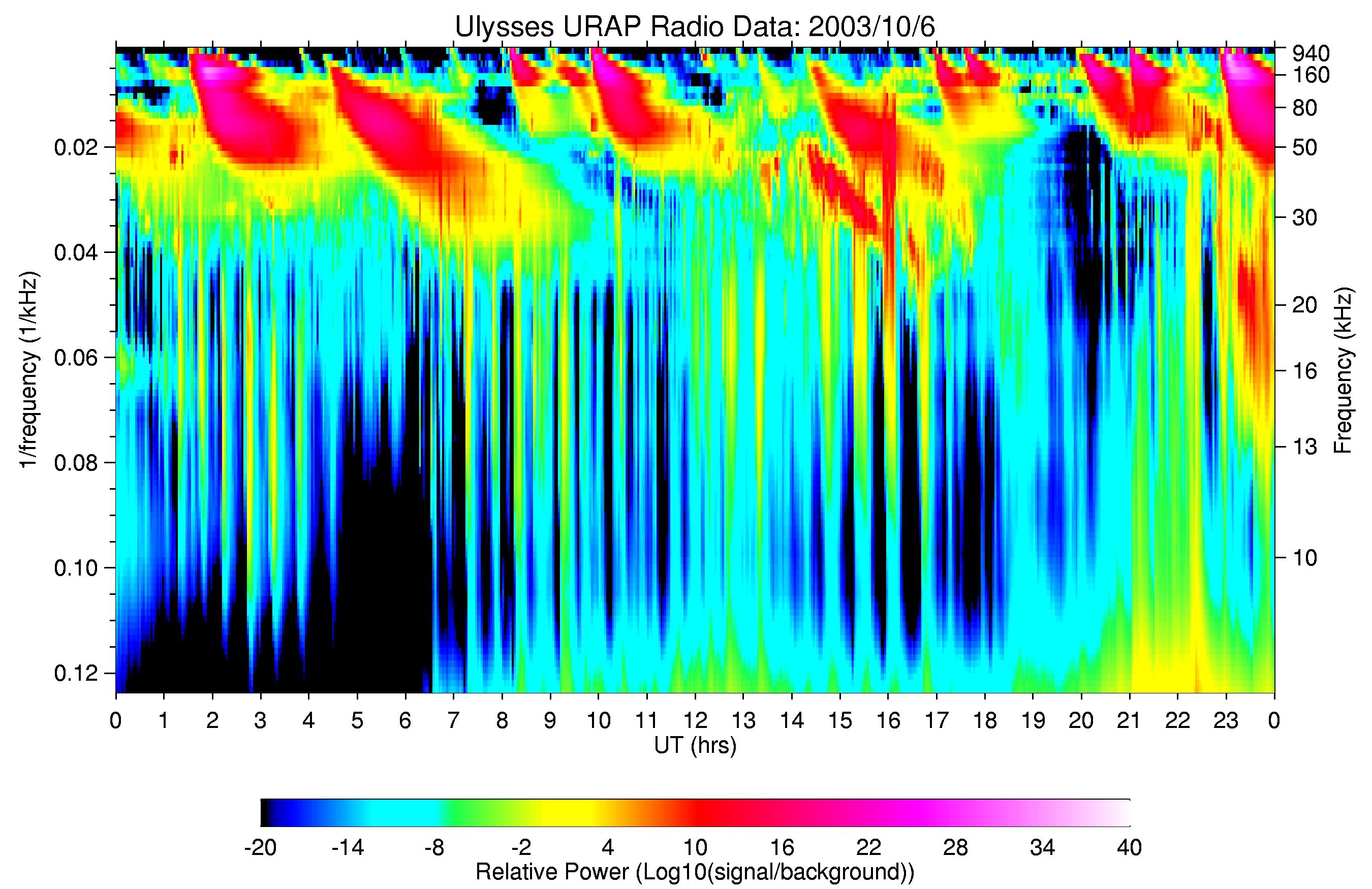 The Ulysses radio astronomy receivers detect both solar and planetary radio emissions. In this figure, showing data acquired in October 2003, the numerous drifting events at the top of the panel are solar type III radio bursts, produced by flare electrons. The other major features are quasi-periodic (QP) radio bursts from Jupiter's magnetosphere. Although the recurrence of these bursts is not yet understood, the Ulysses Jupiter flyby in 1992 showed that they were correlated with relativistic electron bursts in the Jovian magnetosphere.