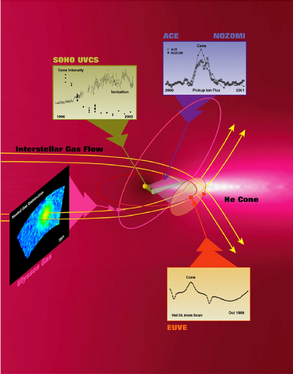 Green insert: UVCS on the ESA/NASA SOHO spacecraft observes the cone intensity at 0.2 - 0.5 AU in the He 58.4 nm line, as the first coronagraph that ever observed the interstellar gas. The green insert shows how the cone intensity decreases from 1996 (solar activity minimum) to 2000 (solar maximum) as the ionization, monitored with the CELIAS SEM sensor on SOHO, increases.
