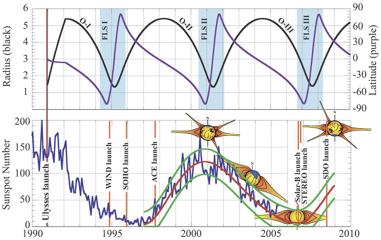 The top plot shows Ulysses's orbit radius and latitude. The lower plot shows the changing solar cycle and key spacecraft launches, during Ulysses's lifetime.