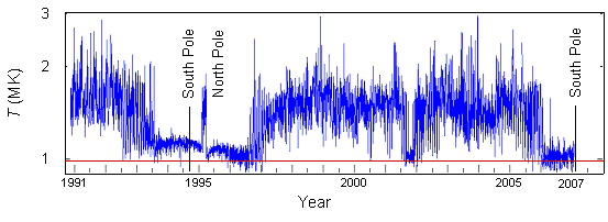 Variations of the coronal temperature measured with the SWICS instrument on Ulysses from December 1990 to January 2007. Solar wind flow from coronal holes is characterized by high solar wind speed (700-800 kms-1) and low coronal temperature (1 - 1.3 MK).