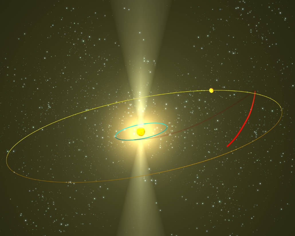 Artist's impression of the first ~2.5 years of Ulysses's journey (in red). The orbits of the Earth (blue) and Jupiter (yellow) are indicated. After sixteen months of interplanetary cruise, the Ulysses spacecraft arrived at Jupiter where, on 8 February 1992, it performed a swing-by of the large planet. This gravity assist placed Ulysses in its out-of-ecliptic orbit: a heliocentric orbit inclined at 80.2° to the solar equator, with an orbital period of 6.2 years, aphelion at ~5.4 AU from the Sun and a perihelion distance of ~1.34 AU.