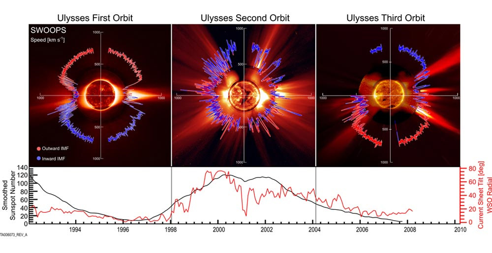 These radial plots of the solar wind speed combine data from all three of Ulysses' polar orbits of the sun, each of which take six years to complete. The blue coloured lines represent the outward interplanetary magnetic field; the red coloured lines the inward IMF. The first orbit occurred during solar minimum and showed slow wind over the equator and a fast wind over the poles. The second orbit showed fast and slow winds at all latitudes, consistent with solar maximum activity. Ulysses has completed more than three quarters of the third orbit, occurring around the current solar minimum cycle. While much of the data gathered thus far is consistent with typical solar minimum activity, surprisingly, it also indicates that the solar wind is about 25 percent less powerful than it was in the previous solar minimum cycle. The Sun's magnetic field flips approximately every 11 years, which explains the reversal of the red and blue IMF lines in the third orbit. A timeline and line graphs showing sunspot frequency are shown at the bottom for comparison.