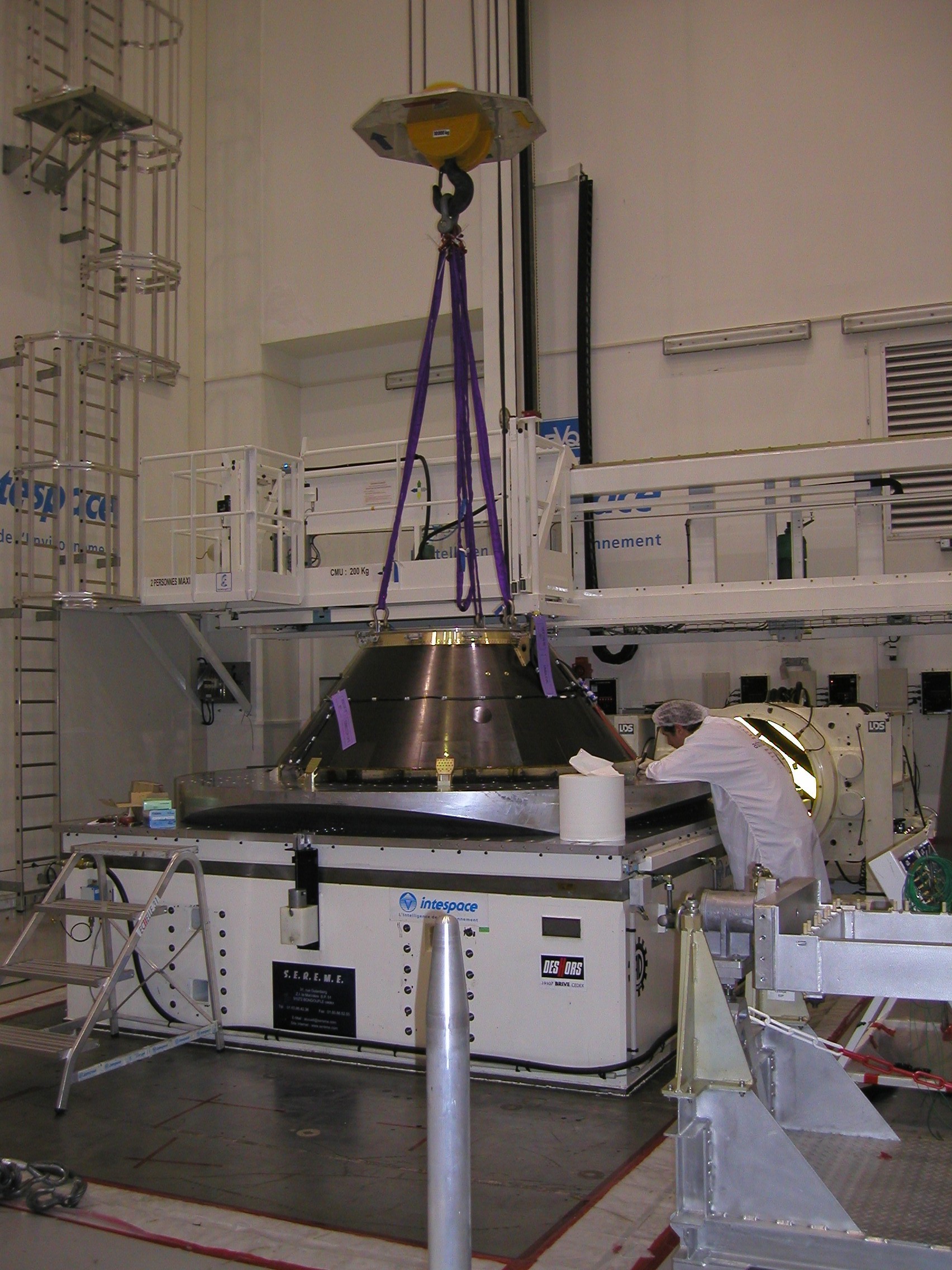 Preparing the shaker platform for vibration testing of Venus Express in Intespace, January 2005. The image show the Launch Vehicle Adapter (LVA) being mounted.