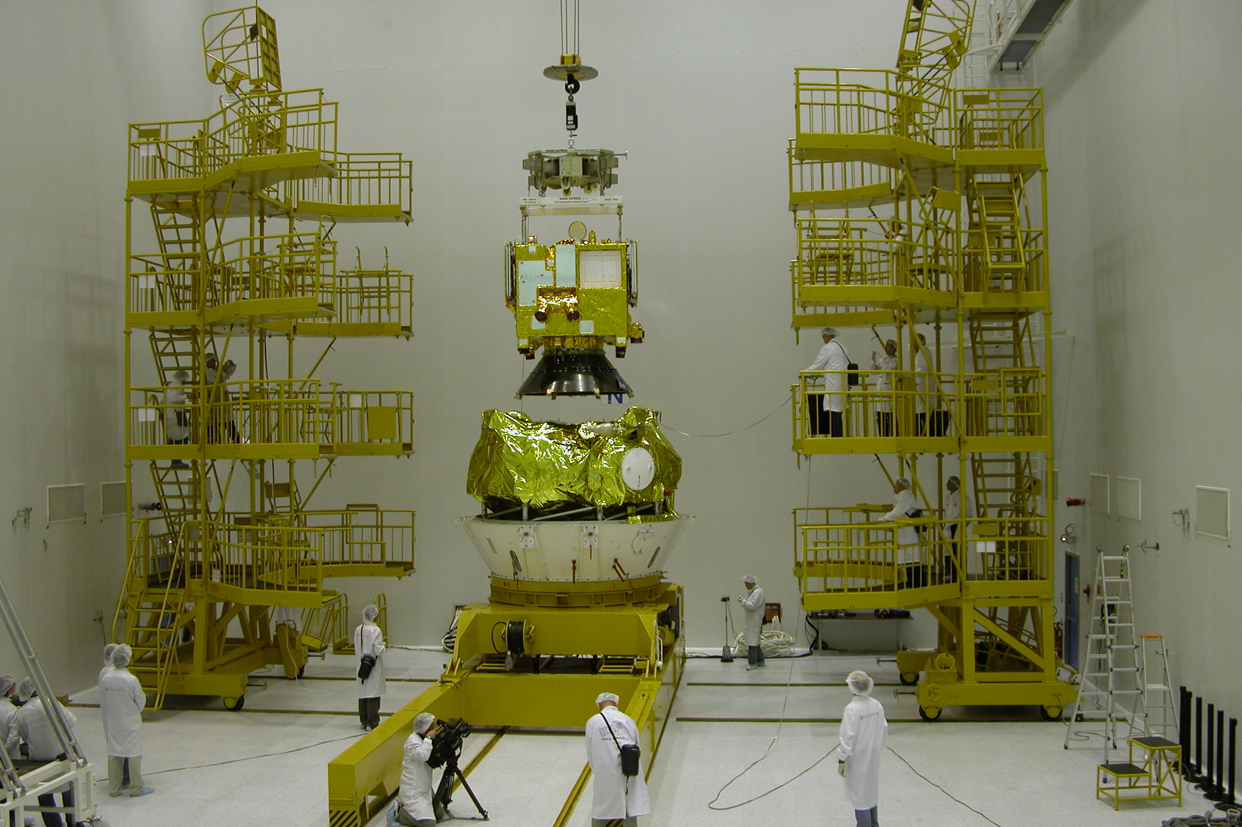Mechanical mating of the stack, the composite of the Launch Vehicle Adapter and Venus Express Spacecraft, with the Fregat upper stage.