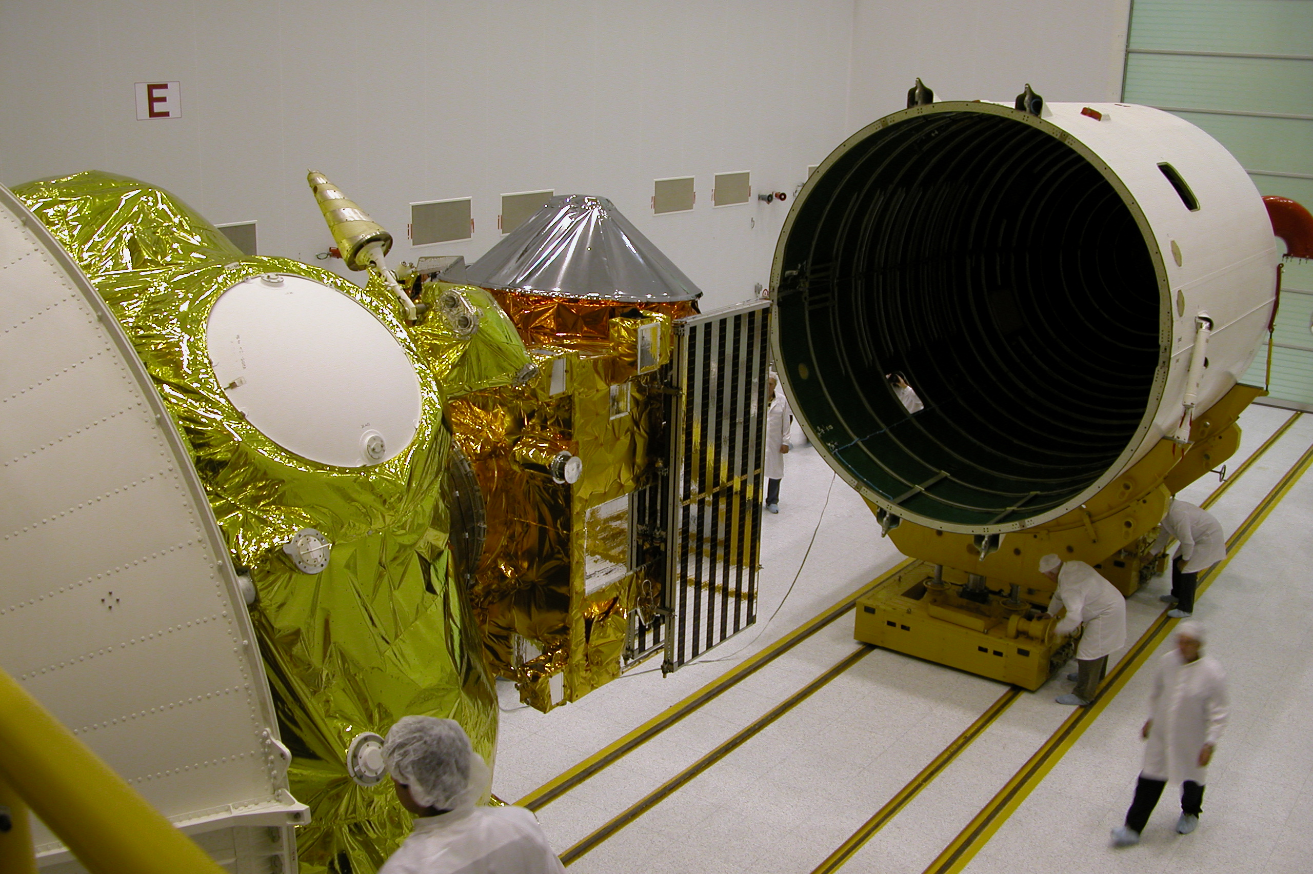 With the nose block fixed in horizontal position a couple of tasks had to be finished by the Spacecraft AIT team before the installation into the fairing could start. All "red tag items", such as the spacecraft's hoisting points, protective covers for the payloads, startrackers, solar array wings, had to be removed to get the spacecraft into its final flightready status. This was followed by the final visual inspection of the spacecraft to give the clearance for fairing installation, after which the spacecraft would not be physically accessible from the outside anymore.