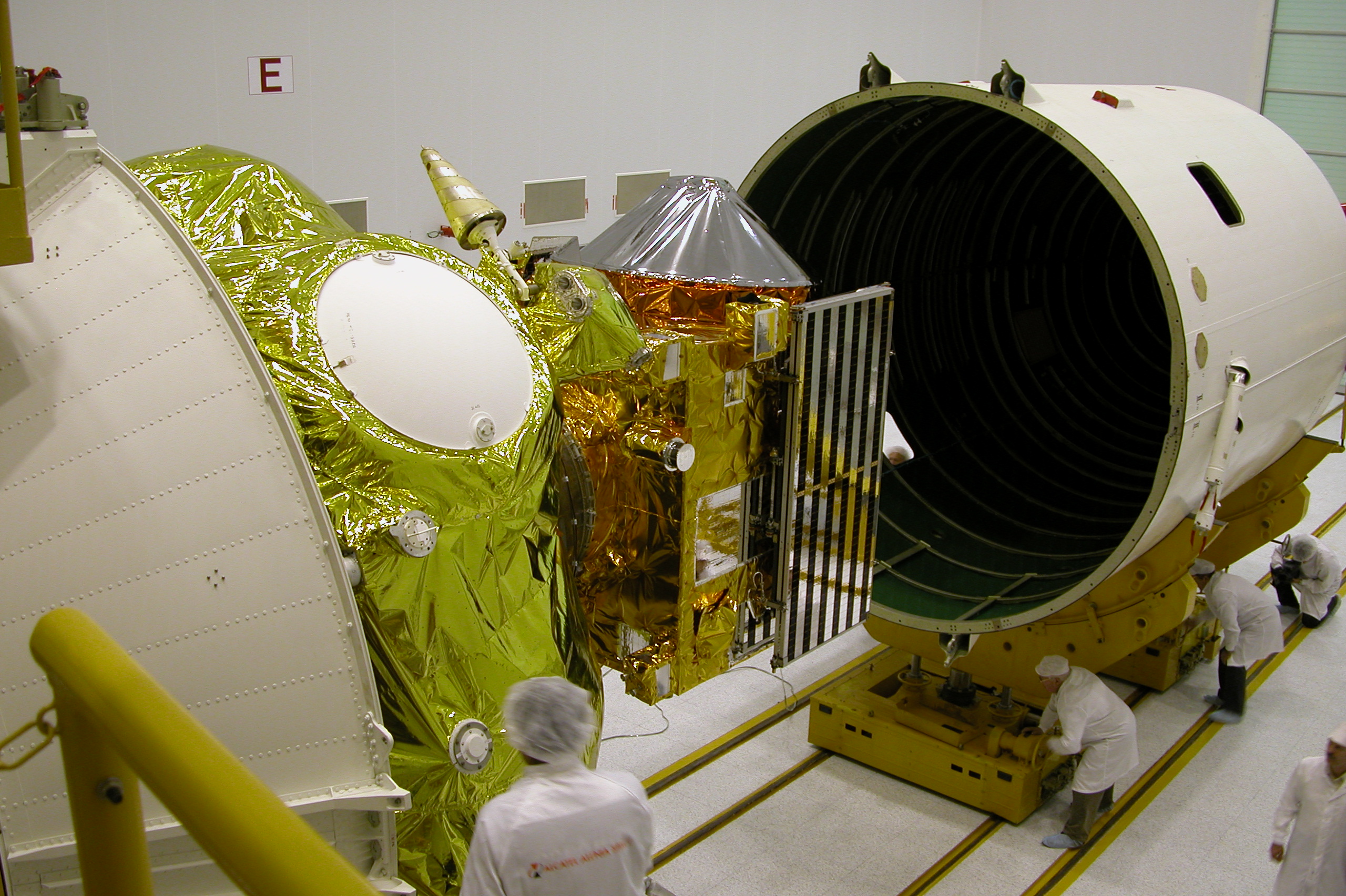 A Russian specialist team proceeded with the installation of the fairing on the nose block. For this activity the nose block remains statically in its horizontal position. The fairing is horizontally installed on a movable piece of MGSE (Mechanical Ground Support Equipment), and is slowly moved over the nose block until it finally covers the Venus Express Spacecraft as well as the Fregat Upper Stage and eventually makes contact with Interstage section which constitutes the interface between Fregat and the Soyuz 3-stage launch vehicle.