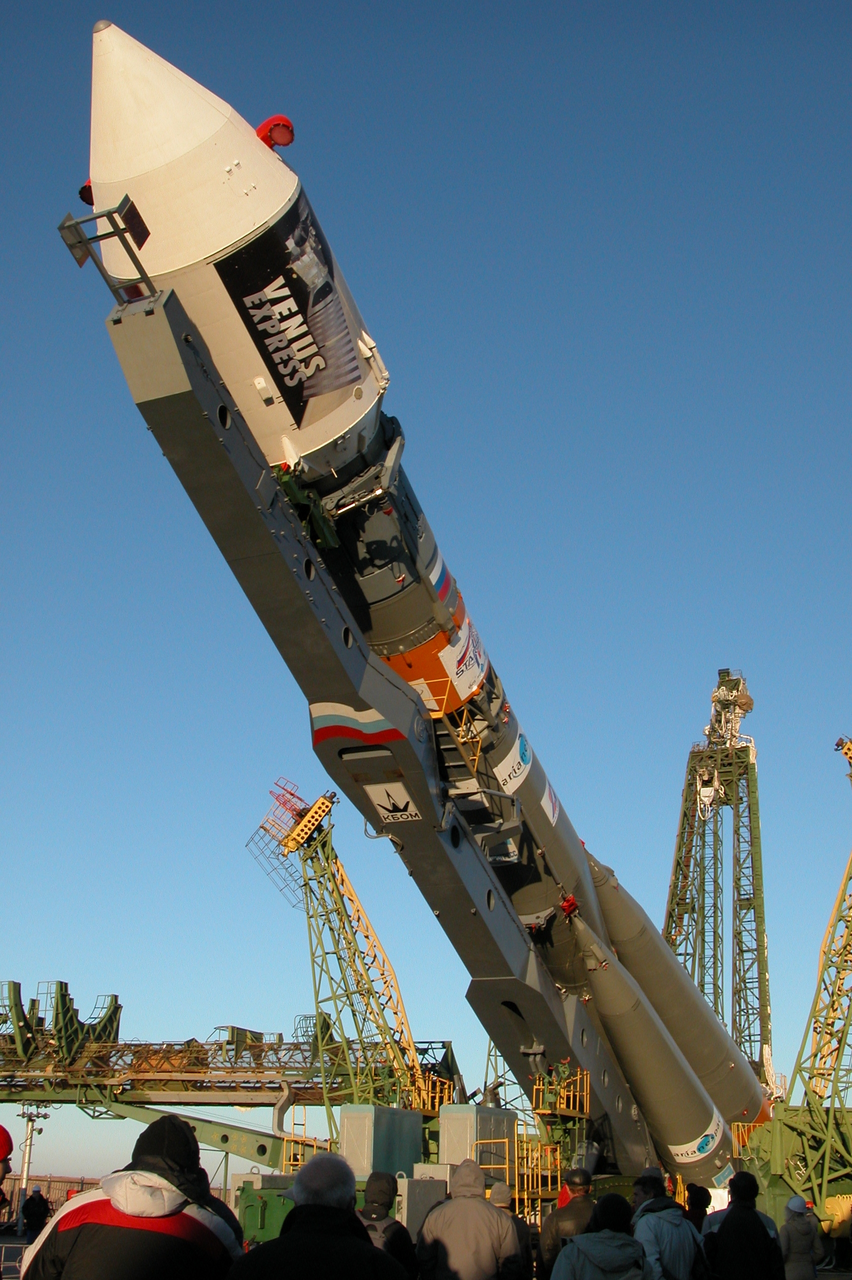 The fully integrated Soyuz FG-Fregat vehicle carrying Venus Express, ESA's first probe to Venus, is erected on the launch pad.