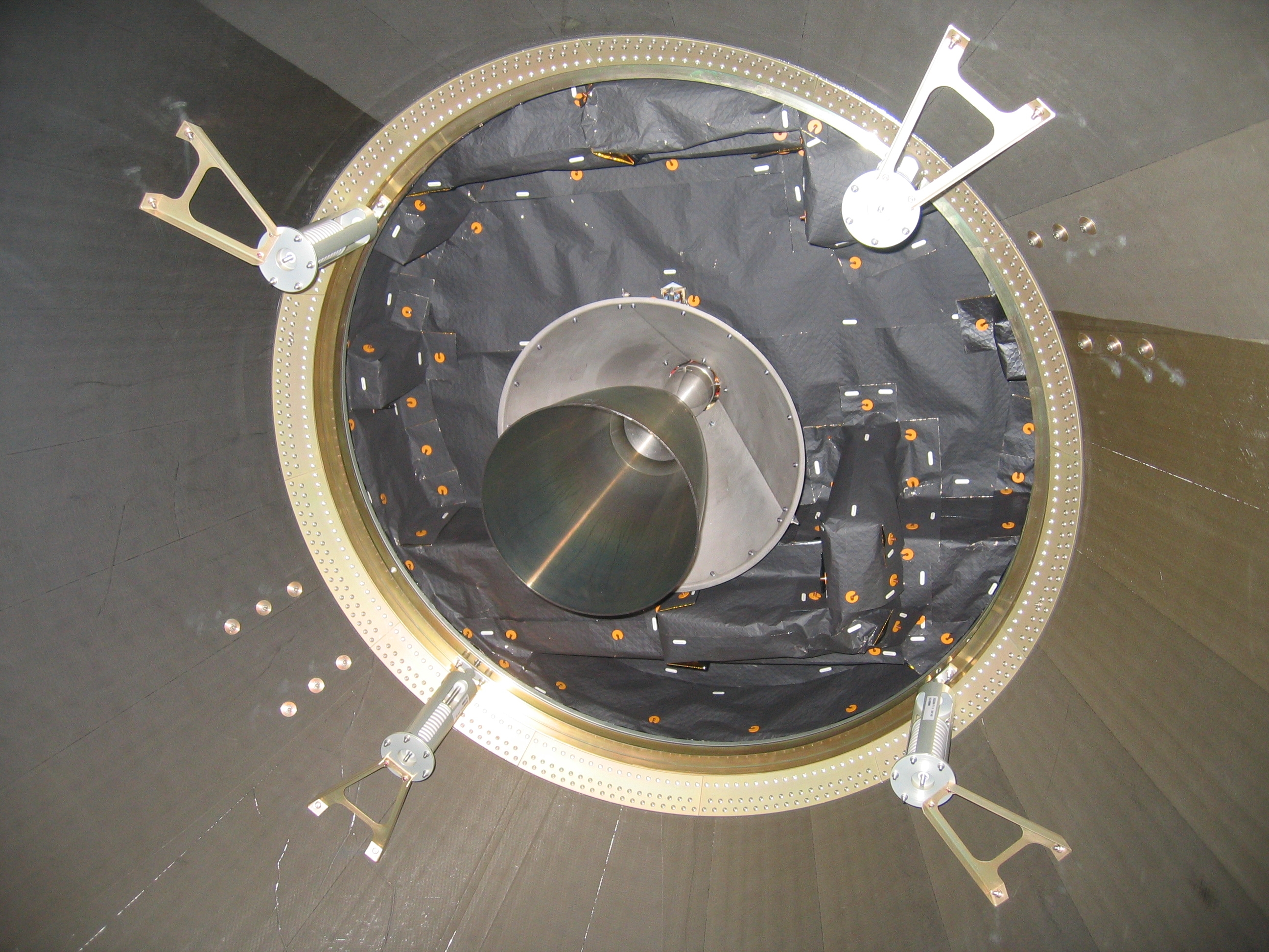 A close-up view of the main engine on the Venus Express during the assembly of the spacecraft.
