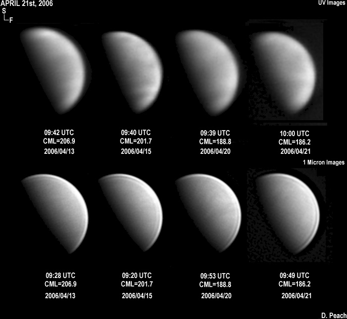 Venus observed by British amateur astronomer Damian Peach, 13 - 21 April, during an observing campaign on Barbados, West Indies. The upper row was taken using a Schuler UV filter at 370 nm, the lower row using Schott RG1000 filter at 1000 nm. Each image was produced by stacking 2000 to 3000 video frames.