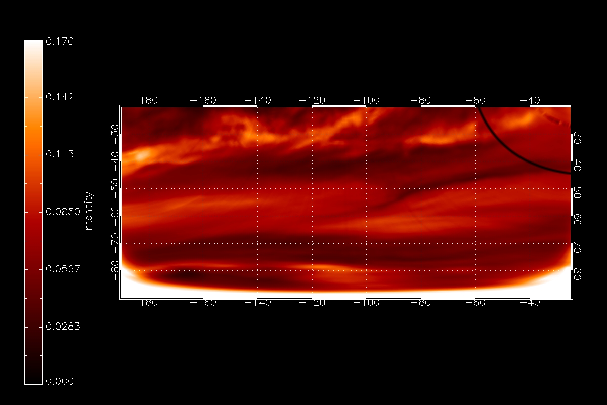 The image, covering a 160° wide strip between latitudes 20° and 90° south, shows clouds being clearly pushed by winds. Using a set of images of the same area acquired at different times, it is possible to make a direct measurement of the wind speed.