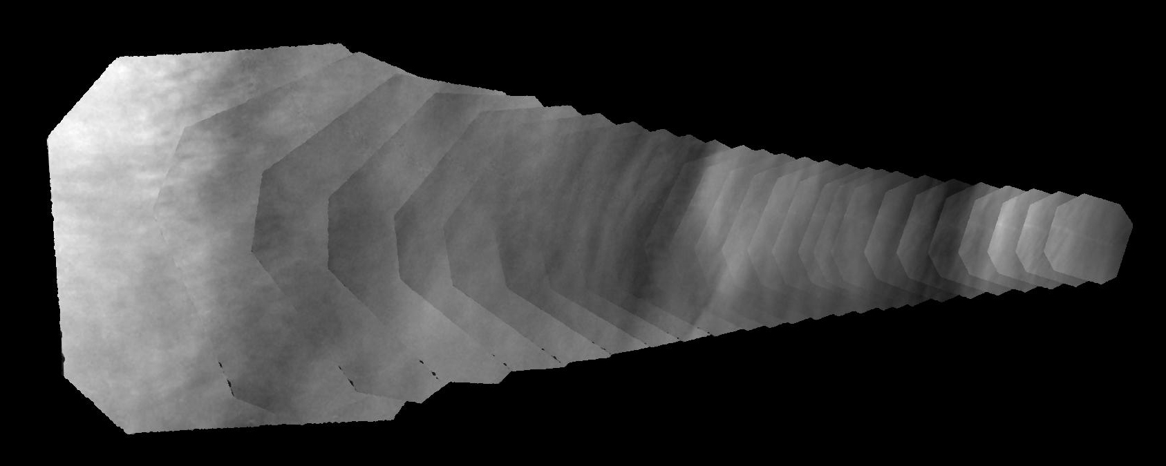 The original images (taken at a wavelength of 365 nanometres) were projected on geographical coordinates. While flying over the cloud deck at high speed (from left to right), Venus Express got closer to the deck itself and obtained ever more detailed images.