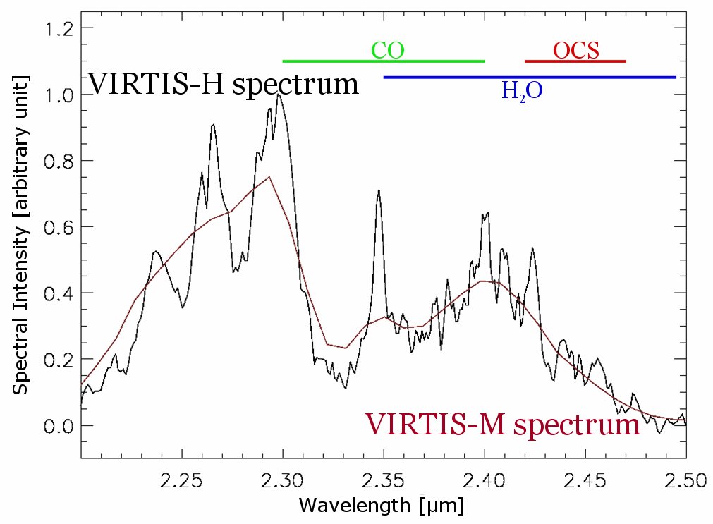 The two spectra are from two different channels of the VIRTIS instrument. The dark red line shows the lower resolution spectrum obtained with the mapping channel, or M-channel, during the Venus orbit insertion in April 2006. The black line shows the spectrum obtained with the instrument's high-resolution channel (H-channel) during orbit #277.