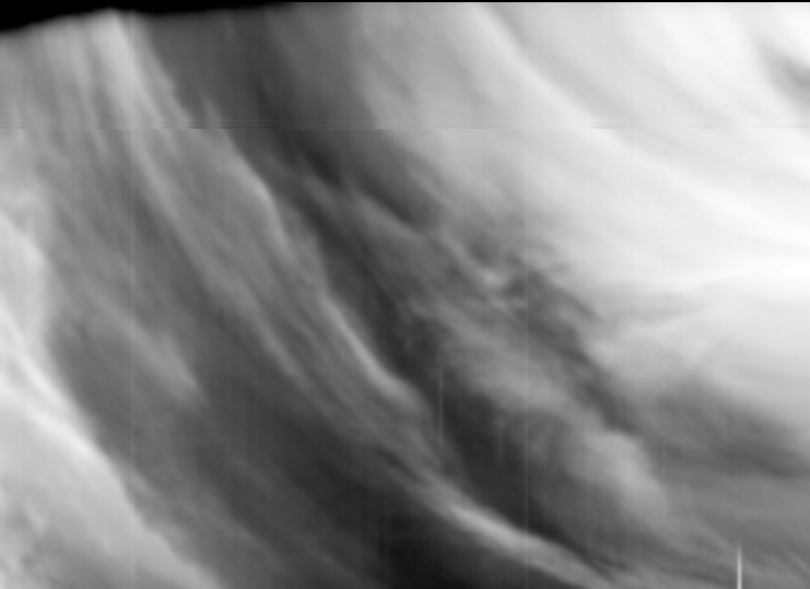At the centre of the image is a large cloud extending toward the bottom-right part of the view. The cloud is about 2000 kilometres long and 500 kilometres wide. It presents the peculiar elongated shape of clouds at Venus, which is due to the planet's high-speed winds.