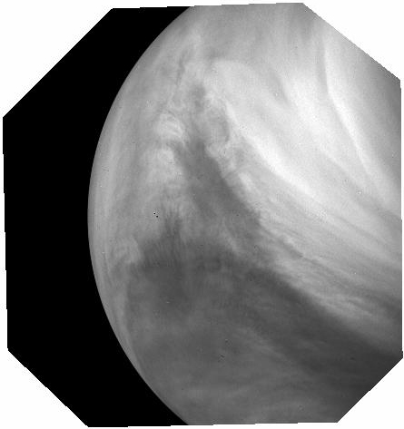 This UV image of the Venus "tropics" was taken by the Venus Express Venus Monitoring Camera (VMC) from a distance of approximately 15 000 km (orbit #920, 27 October 2008). The southern pole is in the upper right corner of the image. The dark area in the lower left is the sub-solar region; small-scale wind streaks on its border mark regions of vigorous dynamics.