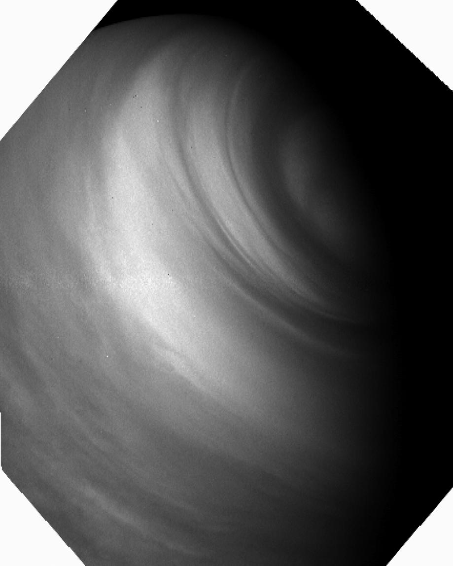 This UV image of the southern polar region of Venus was taken by Venus Express Venus Monitoring Camera (VMC) from a distance of approximately 20 000 km (orbit #1263, 5 October, 2009). The south pole is in the upper right corner. High latitudes are characterized by the presence of thin dark circular or spiral features that indicate local jets and waves.
