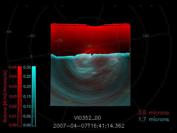 Using specific wavelengths (3.8 and 1.7 microns, respectively), the observations allowed the imaging of the day and night areas around the south pole simultaneously, at different depths (at about 65 kilometres and below the cloud deck, respectively) simultaneously. The intersection between the polar atmospheric structures seen at different wavelengths is visible well, due to the optical properties of the clouds.