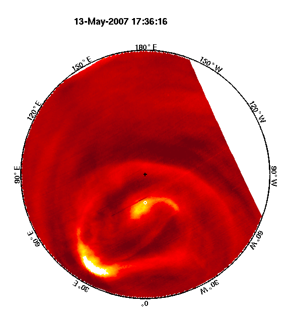 This animation is a reconstruction of the motion of the polar atmosphere of Venus, created by taking 3.8 micron radiance maps of the polar region, obtained during May 2007, and applying a shift (a rotation and translation) to the image based on the measured wind speeds.