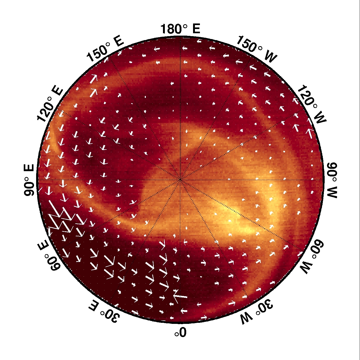 This image shows thermal infrared radiation (at a wavelength of 5 microns) emitted by the cloud-tops at the southern polar region of Venus on 20 January 2008, as viewed by the VIRTIS imaging spectrometer on Venus Express. The white arrows show the atmospheric winds, measured by tracking the movement of cloud features.