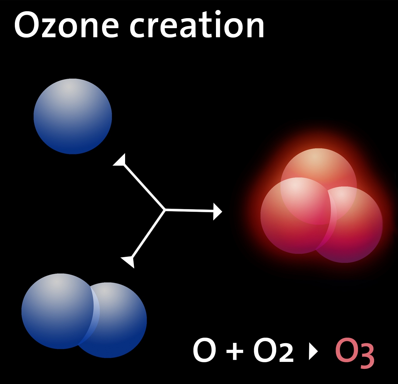 This illustration shows the chemical reaction that gives rise to ozone (O3) in planetary atmospheres with large abundance of molecular oxygen (O2). When irradiated by solar ultraviolet rays, oxygen molecules are broken into atoms (O), which may, in turn, react with other oxygen molecules and create ozone.