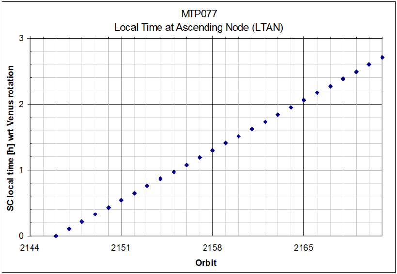 The Local Time at Ascending Node (LTAN) is the local time at which the spacecraft passes the Venusian equator on the ascending branch. For the first orbit (2144, on 4 March 2012), the LTAN is 23:47, for the last orbit (2171, on 31 March 2012), it is 02:42.