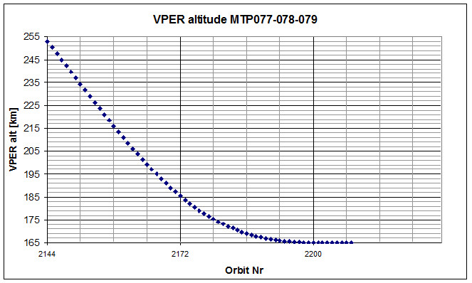 This plot shows the change in Venus Express's pericentre altitude (Y-axis) as the mission progresses, from Medium Term Plan 77 (3-31 March) to 79 (28 April to 26 May). The X-axis shows the orbit number; each orbit lasts 24 hours.