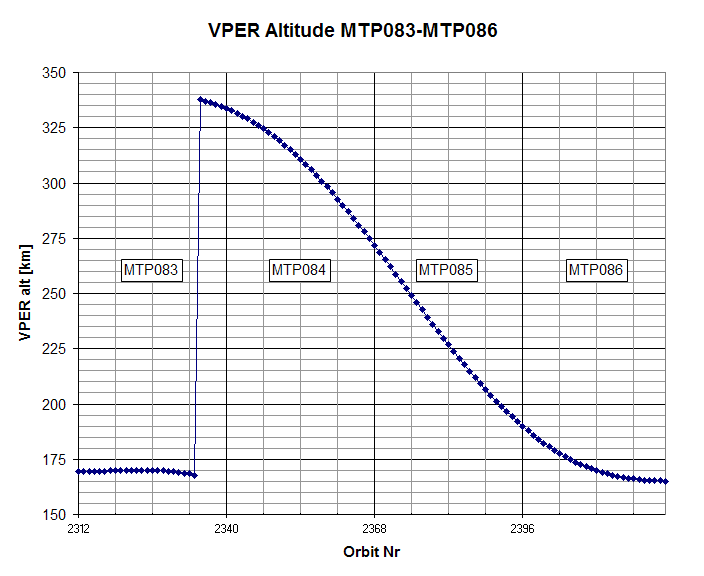 This plot shows the change in Venus Express's pericentre altitude (Y-axis) as the mission progresses, 19 August to 8 December 2012 (medium term plan (MTP) #83 through medium term plan (MTP) #86). The X-axis shows the orbit number; each orbit lasts 24 hours.