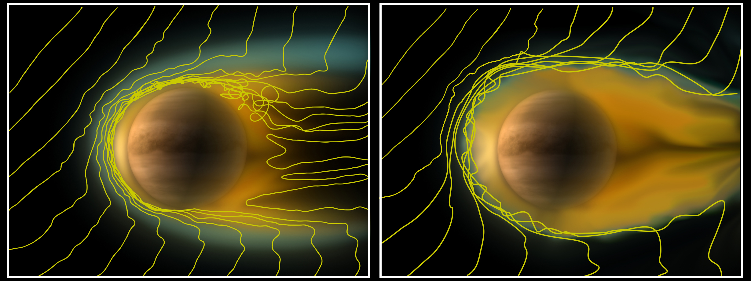 A comparison of the ionosphere of Venus under different solar wind conditions. The yellow lines indicate the solar magnetic field lines as they interact with the ionosphere.