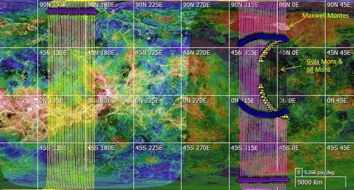 The surface targets included Gula Mons (21.9°N, 359°E) and Sif Mons (22°N, 352°E) in the Western Eistla Regio highland, suspected to be surface manifestations of mantle upwelling (also known as volcanic hotspots).