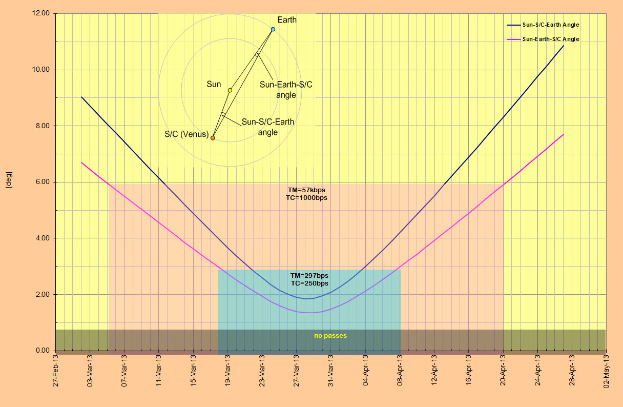 The flight control team therefore decided to shutdown Venus Express science operation downlinks in the period around superior conjunction. Some science observations continued, but were limited by the fact that the data could not be downloaded.