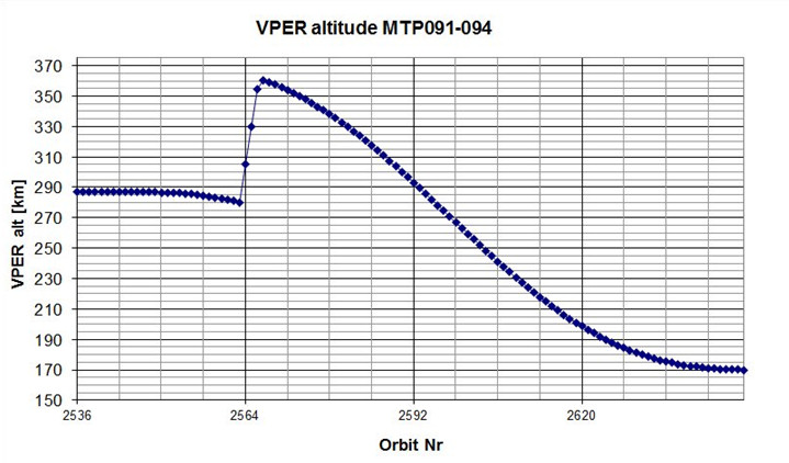 This plot shows the change in Venus Express's pericentre altitude (Y-axis) as the mission progresses, 31 March 2013 to 20 July 2013 (medium term plan (MTP) 91 through MTP 94). The X-axis shows the orbit number; each orbit lasts 24 hours.