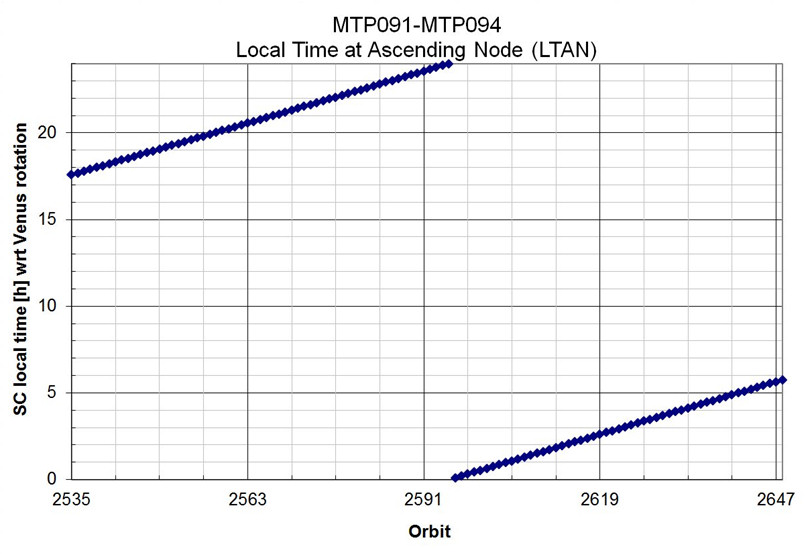 The Local Time at Ascending Node (LTAN) is the local time at which the spacecraft passes the Venusian equator on the ascending branch of its orbit. Values of 6:00 hrs and 18:00 hrs represent sunrise and sunset, respectively, and are on the terminator. LTAN values of 00:00 hrs and 12:00 hrs represent midnight and noon, respectively.