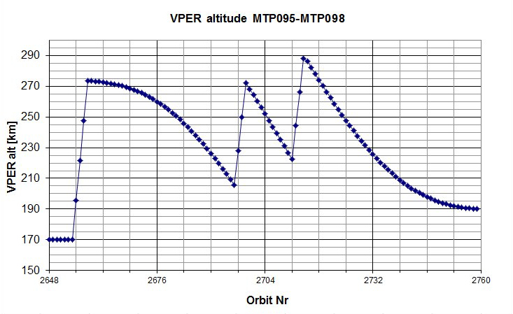 This plot shows the change in Venus Express's pericentre altitude (Y-axis) as the mission progresses, 21 July to 9 November 2013 (medium term plan (MTP) 95 through MTP 98). The X-axis shows the orbit number; each orbit lasts 24 hours.