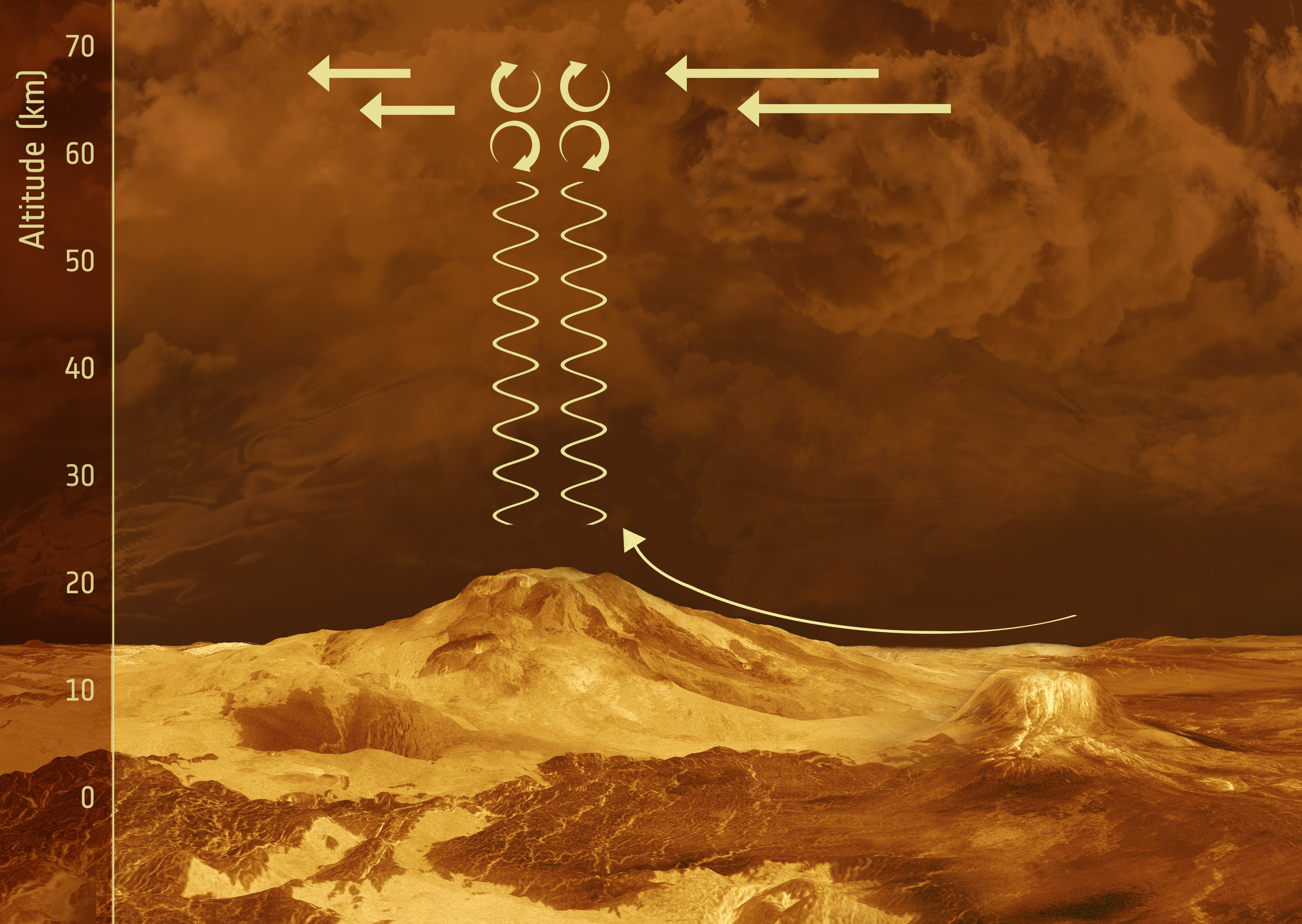 Winds pushing their way slowly across the mountainous slopes on the surface generate gravity waves - an atmospheric phenomenon also often seen in mountainous parts of Earth's surface. These waves form when air ripples over bumpy surfaces. The waves then propagate vertically upwards, growing larger and larger in amplitude until they break just below the cloud-top, like sea waves on a shoreline. As the waves break, they push back against the fast-moving high-altitude winds and slow them down.