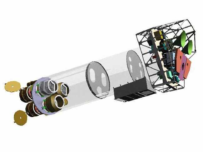 XMM payload sketch - mirror modules lower left; right end focal X-ray instruments; EPIC MOS cameras and radiators (black/green 'horns'); EPIC pn camera radiator (violet); RGS detectors (pink) and radiators (light blue); OM telescope (orange) partially obscured.