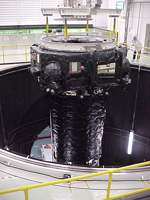 The XMM lower module emerging from the Large Space Simulator in ESTEC.