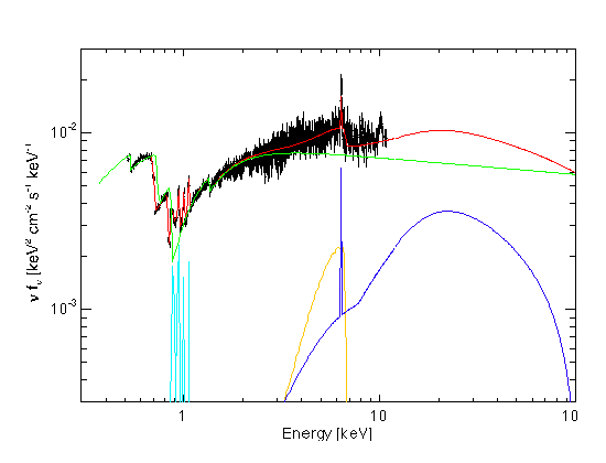 Two lines are present at 6.4 keV: the narrow blue line corresponds to X-rays coming from iron that is far away from the black hole, towards the outer parts of the accretion disc. The broad yellow line is the new mystery feature fully revealed by XMM-Newton.