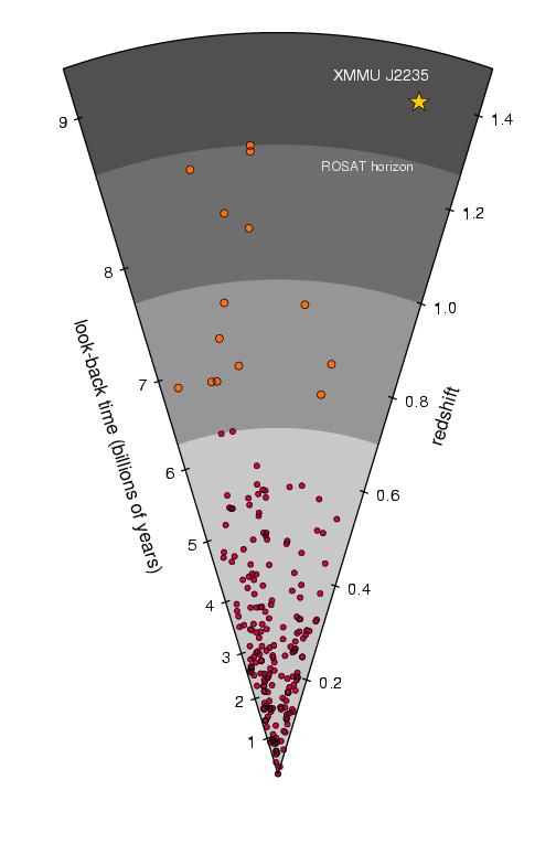 Schematic diagram of the distribution of known galaxy clusters in space. As Earth-bound observers look out from the apex of the cone, they see an increasingly more distant and earlier universe. Distance is marked on the right-hand side in units of redshift, while the corresponding cosmic look-back time is indicated on the left-hand axis. The newly discovered cluster, labelled XMMU J2235, falls in a remote regime, well beyond the horizon of previous studies (labelled ROSAT horizon).