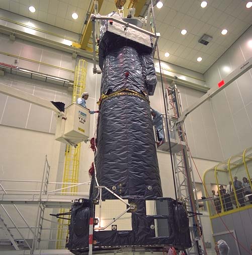 The XMM spacecraft standing upside down in the clean room at ESA's ESTEC facility. Its front end, where the mirror modules of the X-ray telescopes pass through the satellite's service module, is closest to the ground. At the top is the section containing detectors at the focus of the X-ray telescopes. Surmounting the assembly, a pair of cones will carry heat away from the detectors. XMM's appearance is, though, dominated by the long tube that spans the telescope's focal length, and by the black thermal blanket that will protect the spacecraft from unequal heating on the sunny and shaded sides.