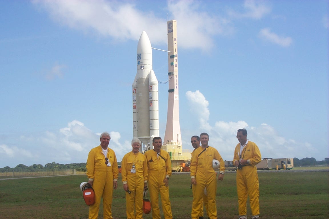 Top ESA, Dornier and Arianespace staff accompany Ariane-5 on the first stage of its journey to the launch pad.