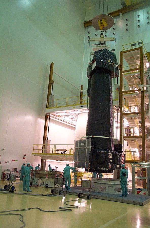 XMM is hoisted in place over the launch adapter (ACU - Adaptateur Charge Utile) in the Final Assembly Building. In the background on the left is the fairing that will be placed over XMM after the spacecraft is mated on top of the Ariane launcher.