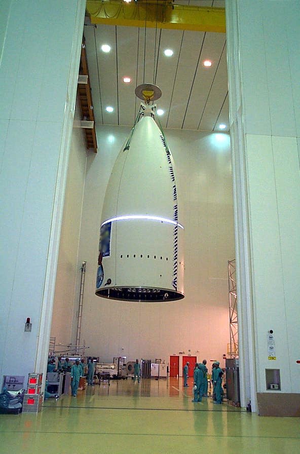 Date: 28 November 1999 Satellite: XMM Depicts: Launcher fairing is hoisted for placing over XMM on Ariane 504 Location: Final Assembly Building, Kourou, French Guiana Copyright: ESA Show in archive: true