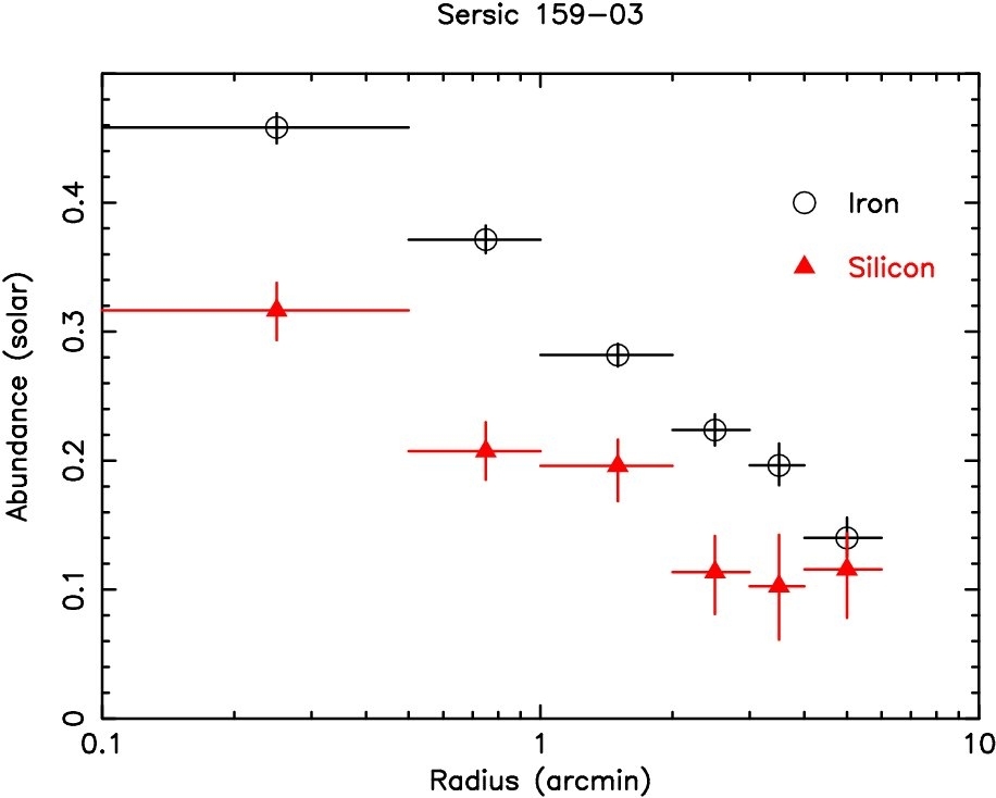The radial distribution of iron and silicon in the cluster of galaxies Sérsic 159-03. While iron is produced mainly by type Ia supernovae, the silicon is produced by both the Type Ia and the core collapse supernova types. The distribution of silicon relative to iron in this cluster is very different to that from cluster 2A 0335+096. This shows that these two clusters had a different evolution.