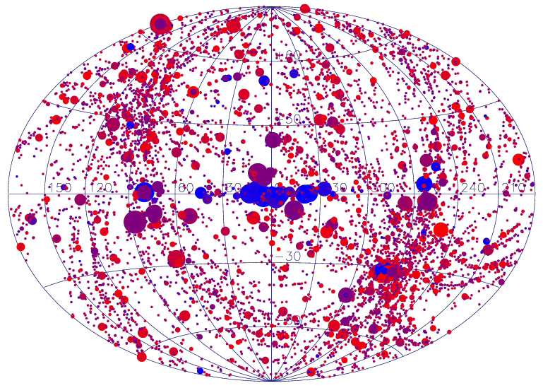 This map of our galaxy shows all the objects that were detected in the XMM-Newton slew survey, one of which was the nova V598 Puppis. The plot is colour-coded such that sources of a lower (softer) energy are red and those with a higher (harder) energy are blue. Also, the brighter the source, the larger it appears on the map. The plot is in galactic coordinates (the centre of the plot corresponds to the centre of the Milky Way).