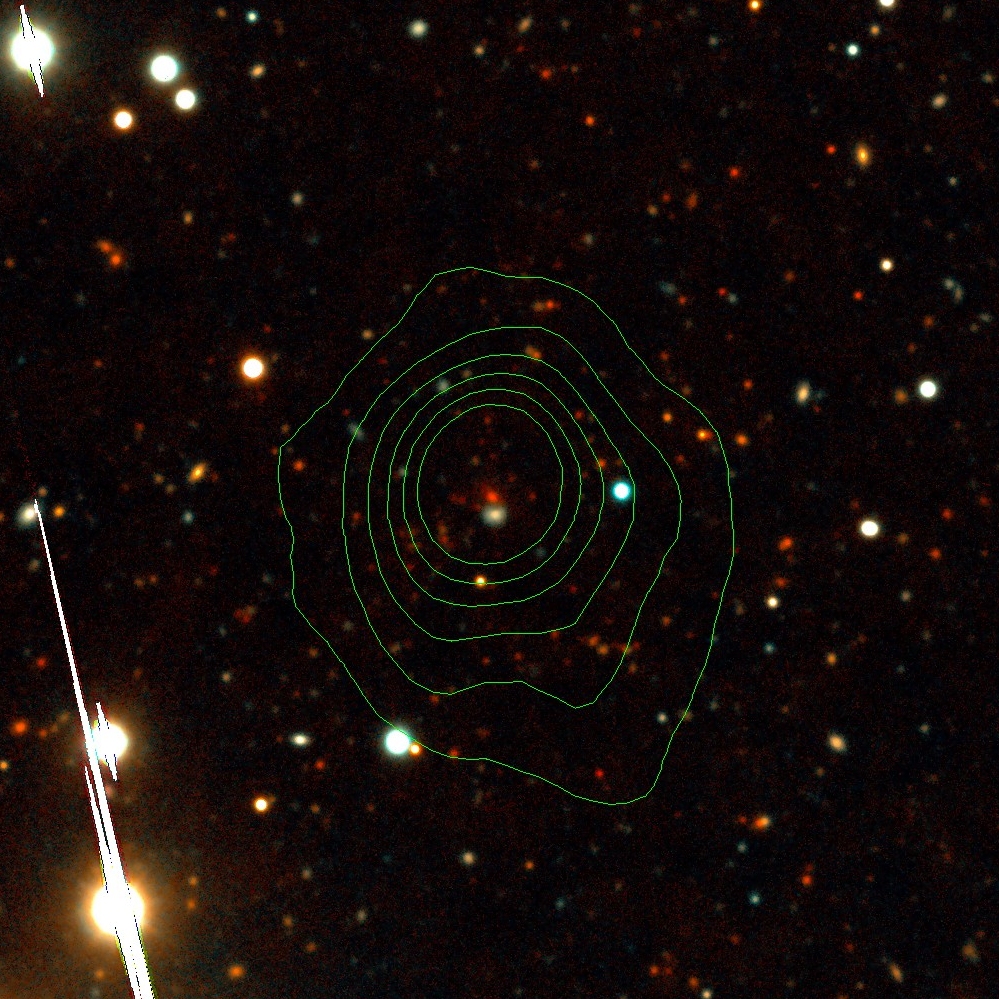 X-ray contours of 2XMM J083026.2+524133 overlaid on an r- and z-band colour composite image. The X-ray contours are from the 2XMM catalogue that is based on XMM-Newton EPIC observations.
